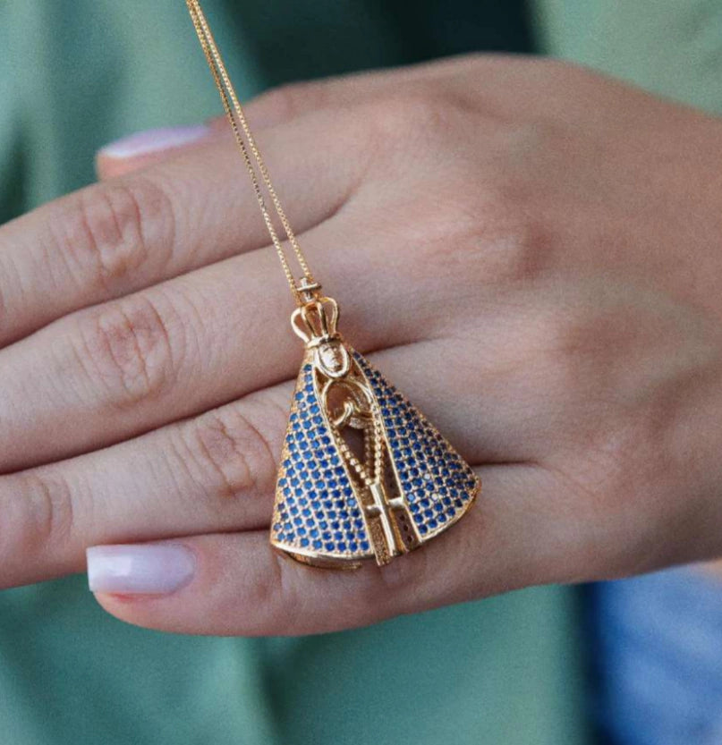 Colar Nossa Senhora Aparecida - Dupla Face | Banhado a Ouro - Cravejado com Zircônia.